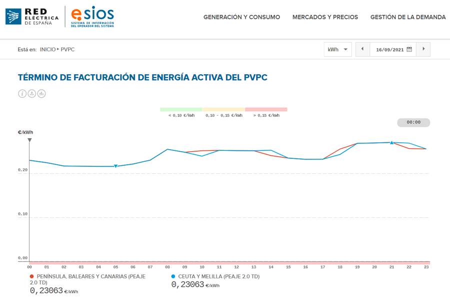 The price of electricity varies every hour and is based on the cost of production of electricity, which is determined based on the hourly market price. Red Eléctrica de España, S.A. publishes the PVPC energy billing term in the evening for the following days 24 hours.
