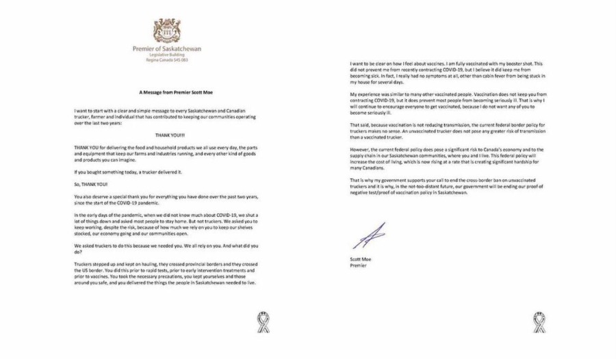 Saskatchewan Premier Scott Moe pledged to end the province’s proof of vaccination policies in a letter to truckers posted on Facebook Saturday morning.