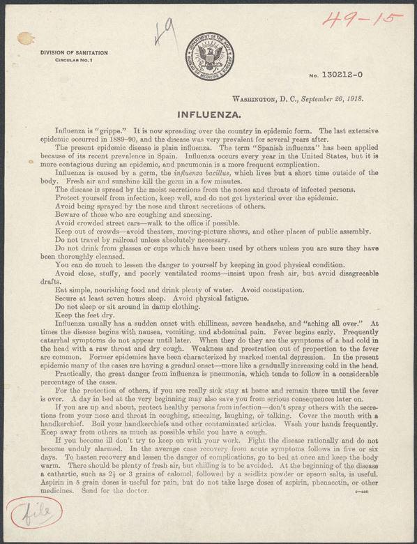 Public document issued by Washington D.C. on September 26, 1918, in response to the Spanish flu.